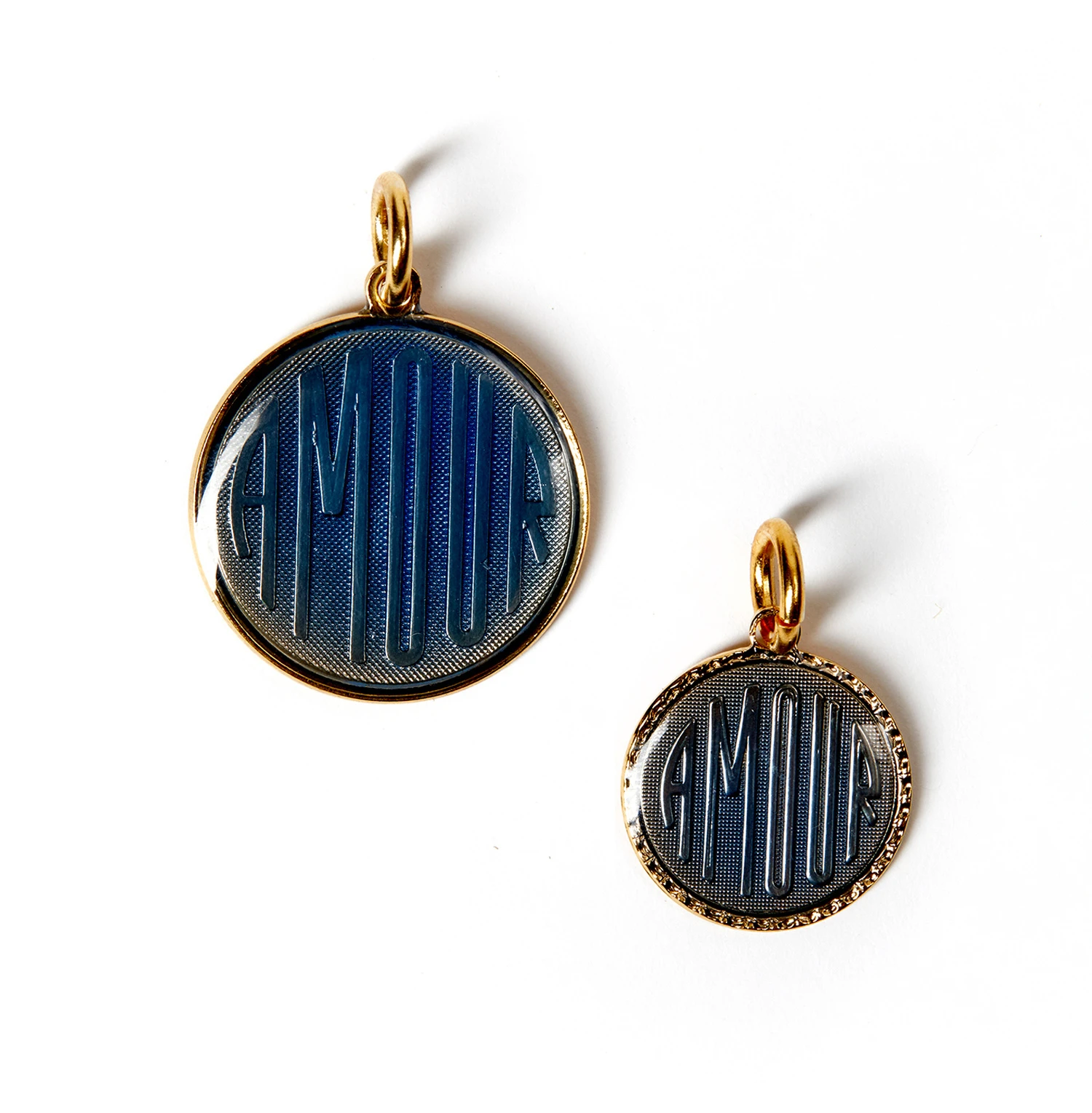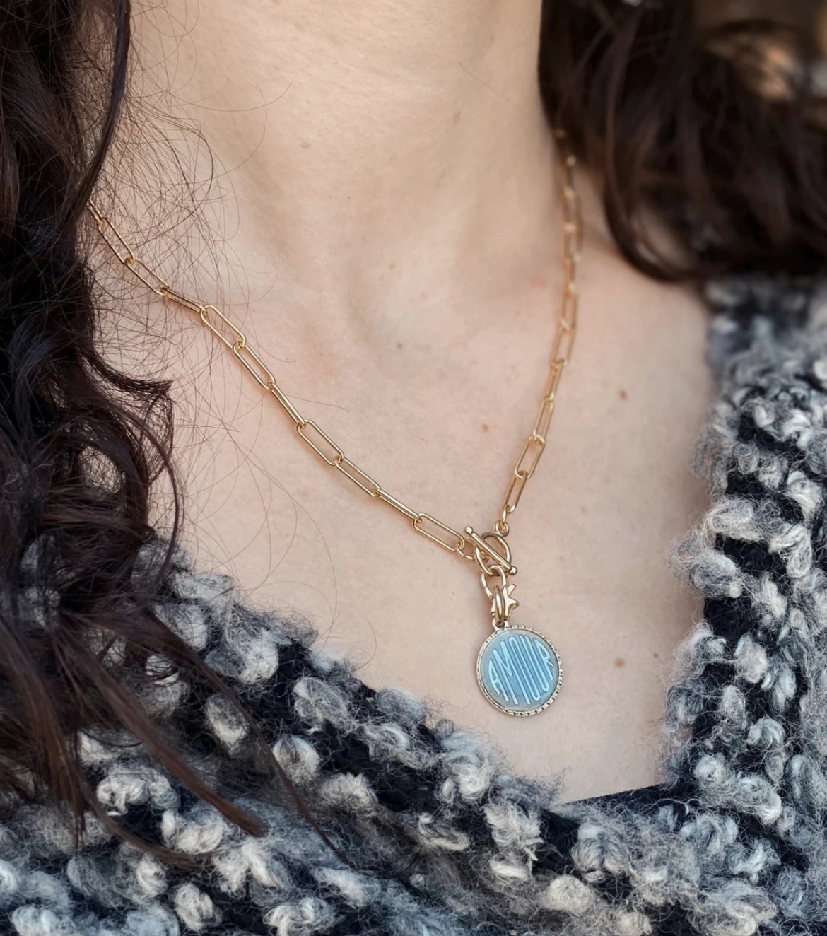 The styled photo features our Amour en Bleu Charm on the London Paperclip Chain Necklace.