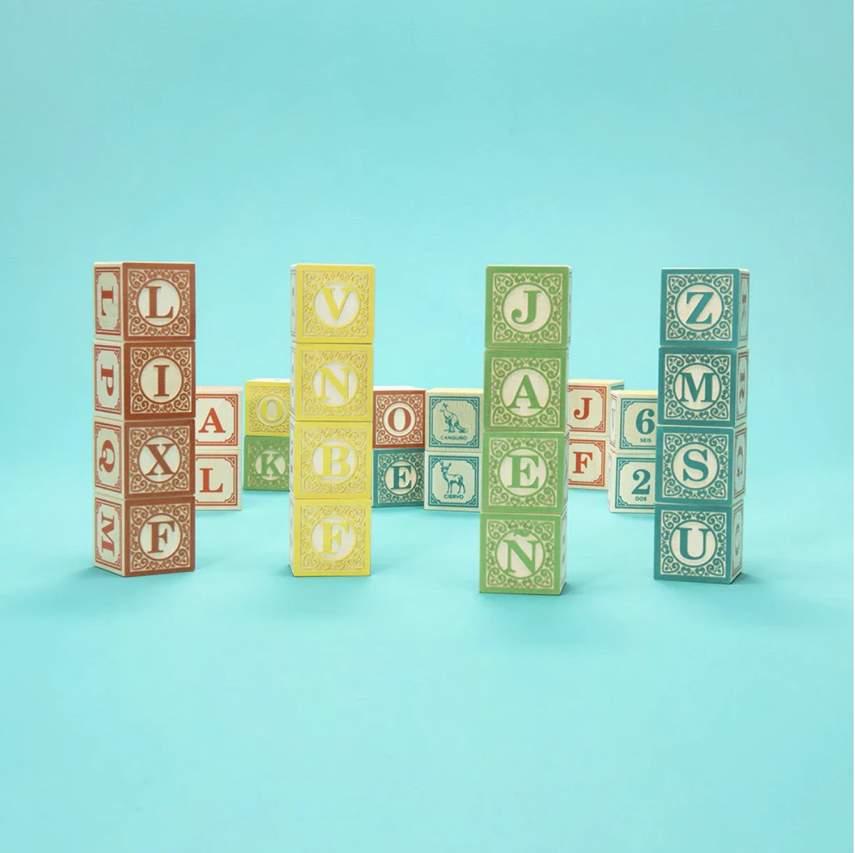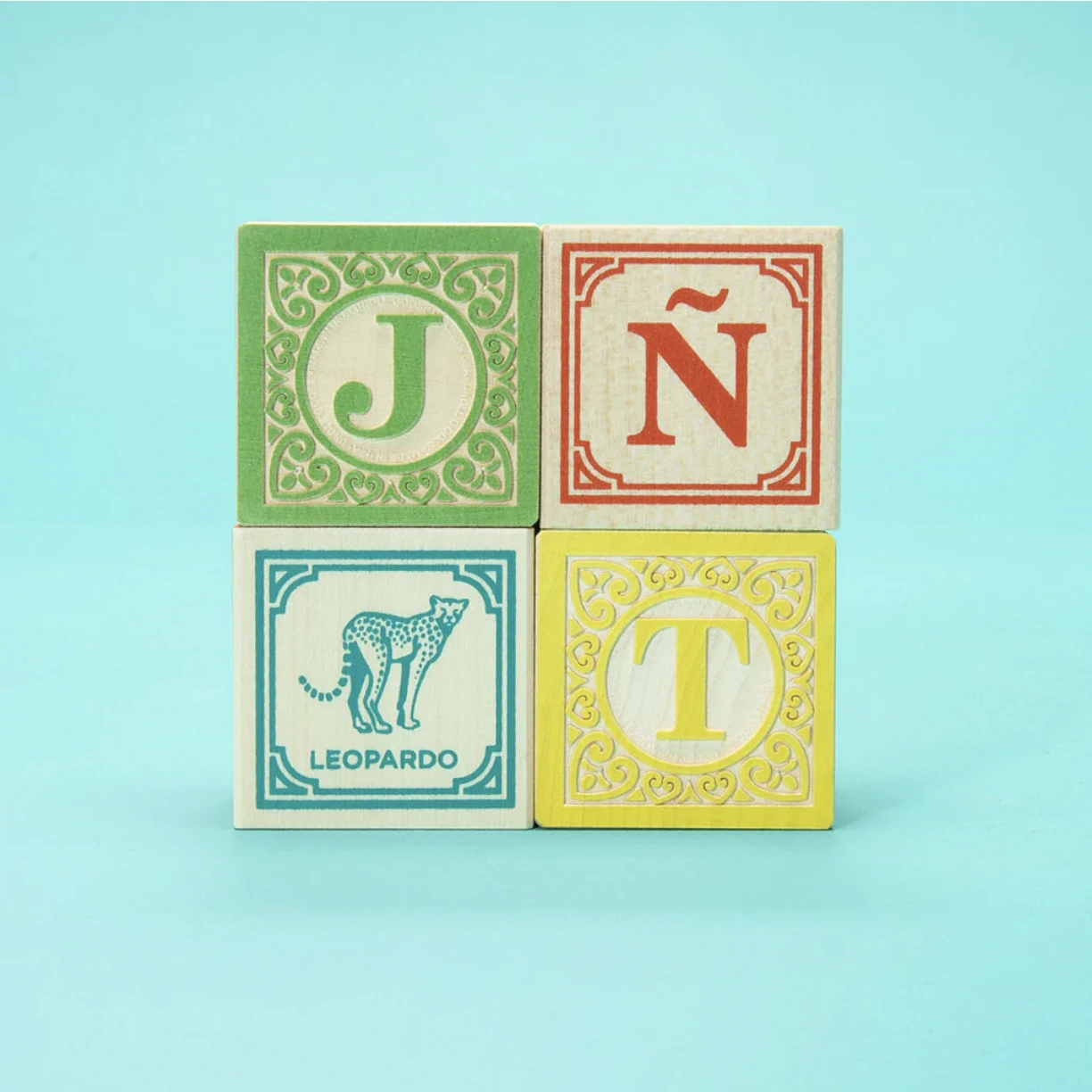 Expand your knowledge of Spain and the Spanish language. Enjoy the embossed Spanish Corazon design elements that surround two letters on each block.