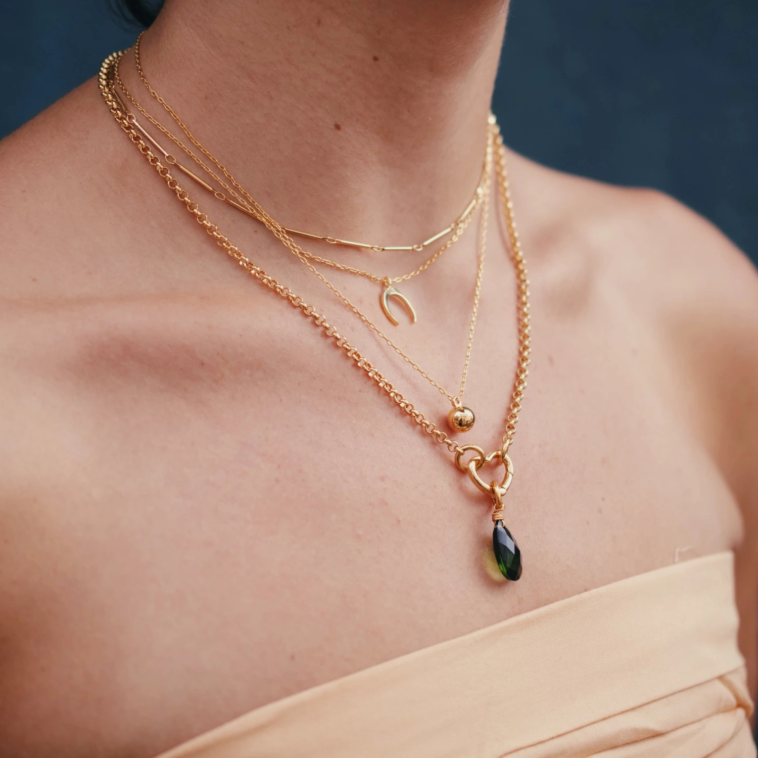 The styled photo features our Golden Orb Necklace with the Crescent Moon Necklace, Stick Chain Necklace, Rolo Connector Chain Necklace, Heart Charm Connector, and Emerald-Colored Stone Drop Charm.