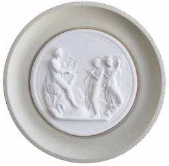 Three of the muses from Greek mythology are captured here in a unique plaster cast intaglio, framed by light linen. Perfect for anyone with an eye for Classical Romantic decor.