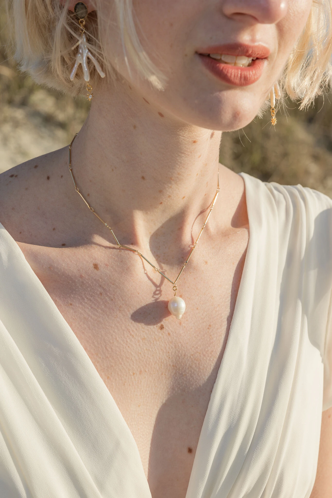 Styled photo features the Drop of Venus Necklace and the Starlight Coral Earrings.