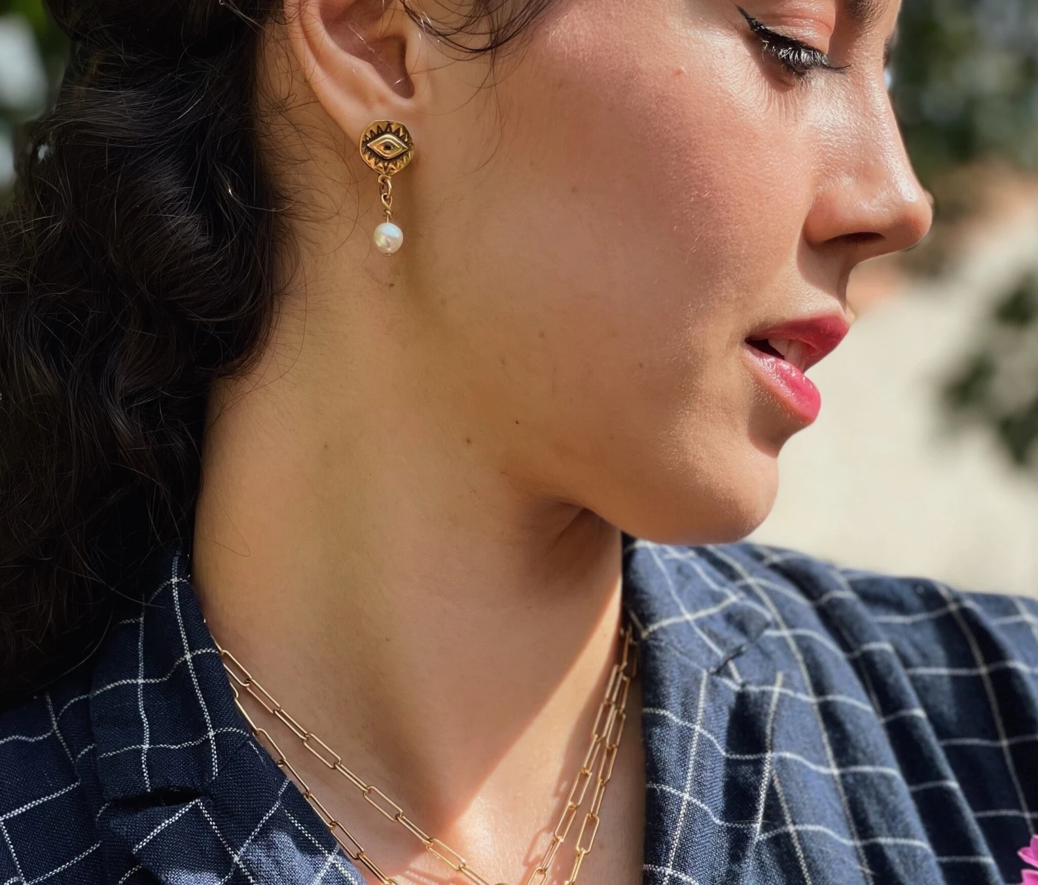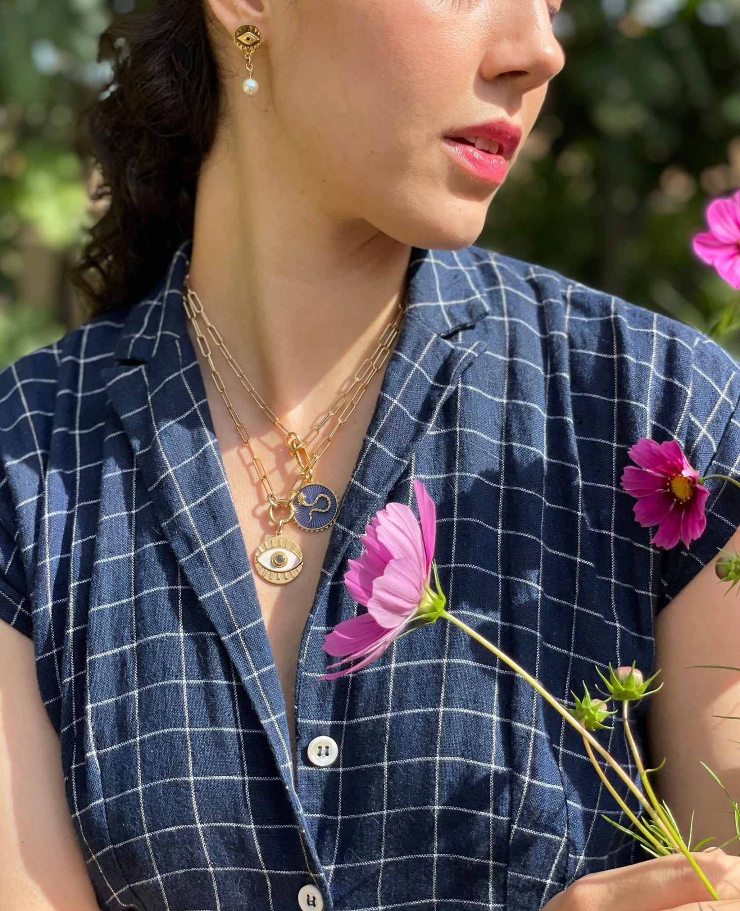 The styled photograph features our Evil Eye Earrings with the London Paperclip Chain Necklace, Circle Charm Connector, Serpent Charm, and Evil Eye Charm.