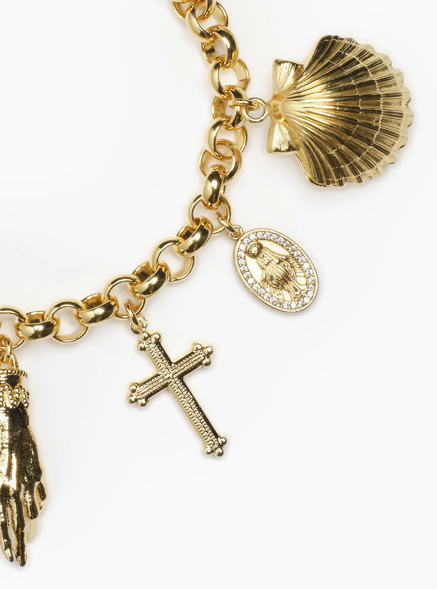 | Materials: | 14k plated gold over brass charms, Rolo chain, German glass stone |