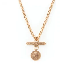| Materials: | Double-sided coin with bar on rolo chain; flash plated antiqued gold over brass. |