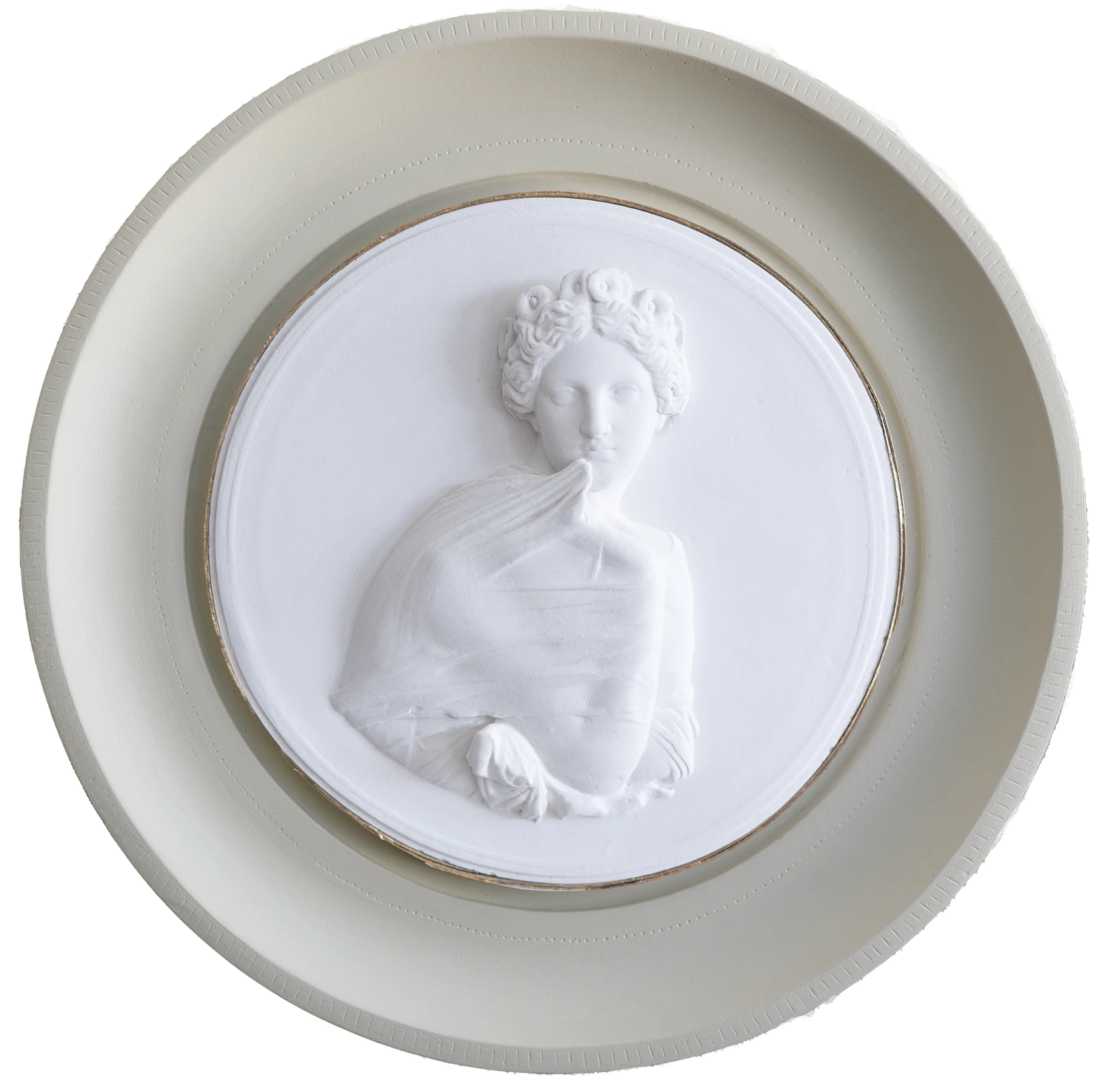 Polyhymnia, Muse of sacred poetry, hymn, dance and eloquence, is often depicted in a more serious posture than her sisters, often with a hand lifted to her lips or dressed in a long cloak or veil as seen here. A unique plaster cast framed in linen.
