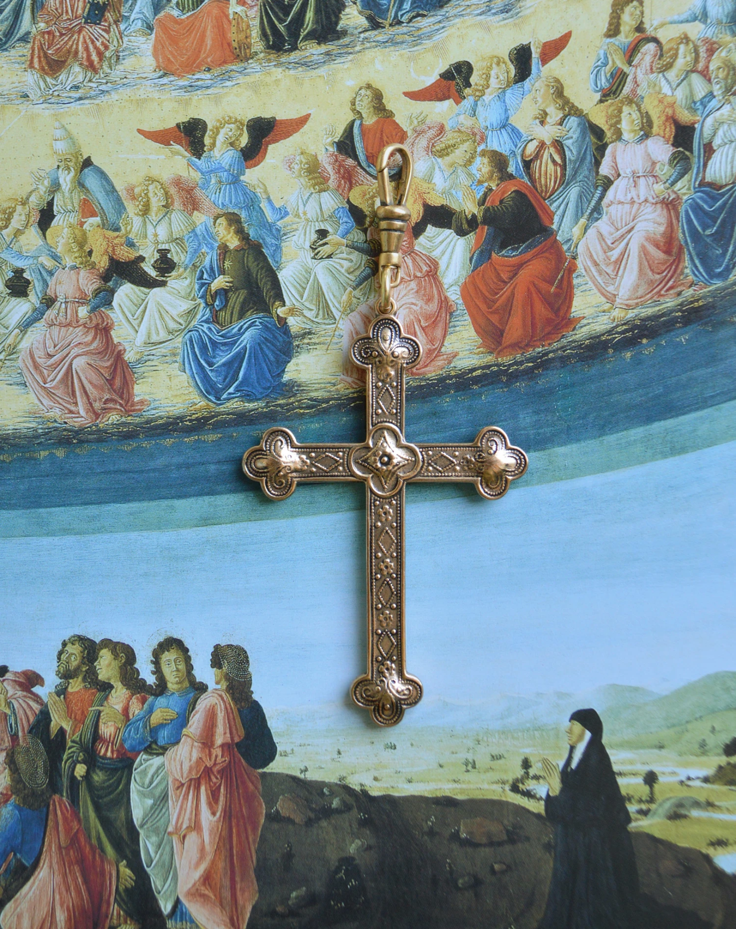 The styled photo features our Hand Pendant Necklace with the Prosperity Coral Charm, Roman Cross Pendant, and Amethyst Colored Stone Drop