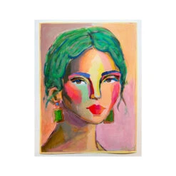 Warm and mysterious, this portrait features a woman with curly green hair piled on top of her head, skin awash in shades of peach, yellow, and blue, a matching pair of emerald-green earrings dangling from her lobes. Made by Kelsey Howard.