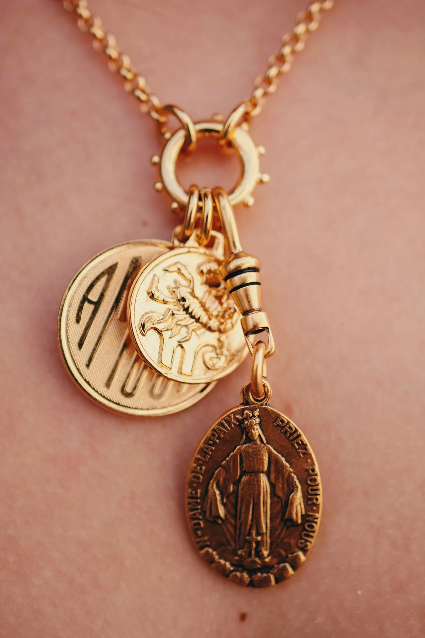 The styled photo features our Amour Charm with the Scorpio Charm and Saint Charm on a Circle Dot Charm Connector and 3mm Rolo Chain.