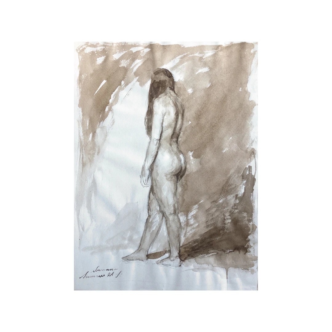 Figure drawing and anatomy study are at the heart of the classical tradition. The artist observes the graces and movements of the female form in a live studio modeling session, as a study for a larger painting.