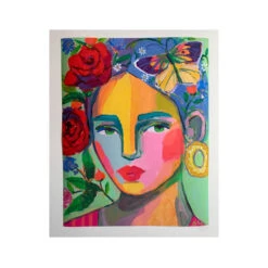 A woman made of gold, blue, pinks, orange, and red peers out with emerald-green eyes, her hair surrounded by lush roses, butterflies, and other flowersโa romantic and thoughtful composition. Made by Kelsey Howard.